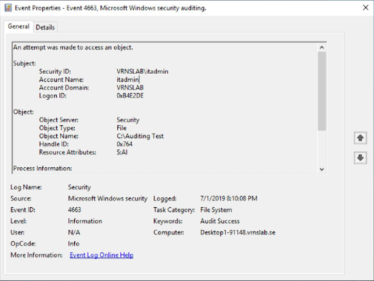 Once you have enabled the Auditing GPO and set the file/folder auditing, you will see audit events in the Security Event Log in Windows Event Viewer.