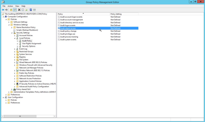 On the required Windows server, open the Domain Controller (DC) and update the Group Policy (GPO) to enable file auditing.