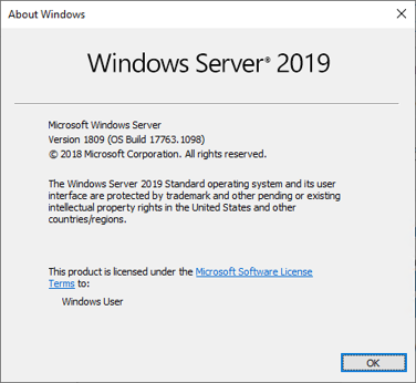 - Run the command “winver” from a cmd, windows search or Win+R keyboard shortcut. The resulting window should be something like this: