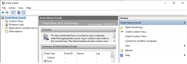- Run the command eventvwr from a cmd, windows search or Win+R keyboard shortcut. The resulting window should be something like this: