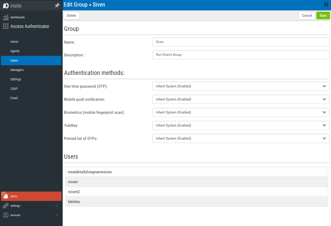 Choose Delete to remove the Group from Access Authenticator. Choose Cancel to dismiss the screen without making changes. Click Save to save the Group's settings and return to the Users screen.