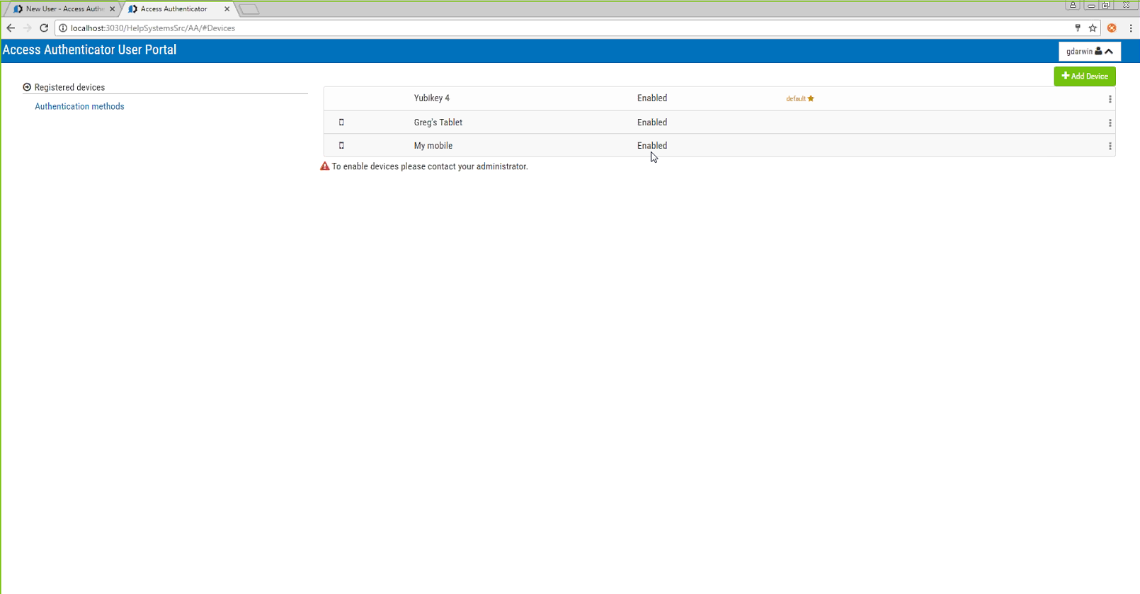 - Disable. Choose this option to prevent the device from being used to authenticate. You might choose this option if, for example, the device has been lost. Once a device has been disabled, it cannot be re-enabled by the user. It can only be re-enabled by the administrator. A disabled device also cannot be deleted and re-registered. Because of this, a lost or stolen device, once disabled, cannot be used to authenticate.