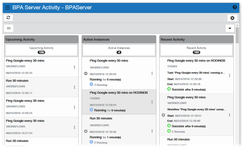 - Active Instances: Displays the automation objects that are currently running or waiting to run. For more details, see Active Instances.