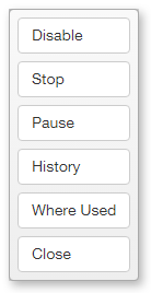 - Pause/Resume from Pause - Suspends execution of the active workflow or task or resumes execution of a paused workflow/task (does not pertain to processes). The Pause and Resume from Pause option alternates depending on the current state of the selected workflow/task.
