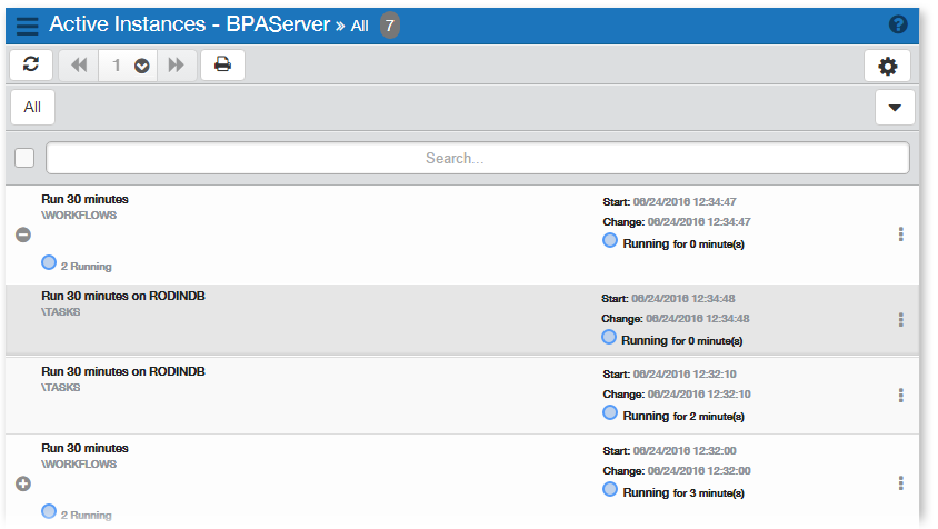 The Active Instances page displays automation objects that are currently running or queued. You can view workflows, tasks, and processes that are in a running state and determine which workflows are placed in a queue of waiting workflows based on their priority.