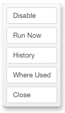 • Disable/Enable: Disables the workflow from being automatically launched by a trigger or enables a currently disabled workflow. A Disabled icon is positioned next to the name of a disabled workflow. The option Disable or Enable alternates based on the current condition of the workflow.