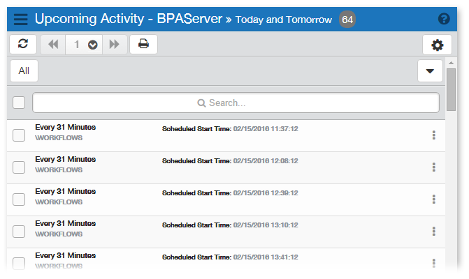 To view the Upcoming Activity page, clicktap Automate Enterprise Activity under the Automate Enterprise menu to open the Automate Enterprise Activity page. Then, click the area at the top of the Upcoming Activity list that displays total records. If the menu on the left is hidden, clicktap the Menu button in the upper left corner to show it.