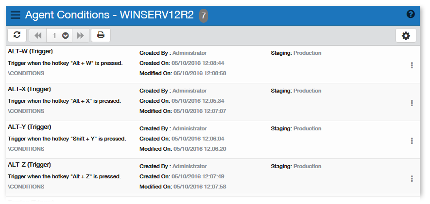 The Agent Conditions page displays information about the conditions that are currently being monitored by a specific task agent. Use this page to retrieve important data about each condition, such as condition name, type, repository location, staging status, creation date, last modified date, and more.