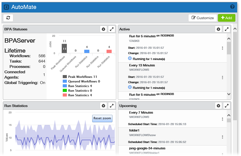 The dashboard is made up of one or more customizable Widgets, which are gadgets that presents specific data types in various formats, such as charts, tables or graphs. Widgets provide "snapshots" of your work environment and helps you keep an eye on your workflows and the logical tasks, processes, and conditions that they coordinate.