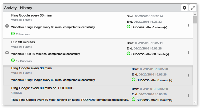 The History widget shows information about previously run workflows, tasks and processes. This data is identical to what appears in the Recent Activity page of a workflow, task, or process but conveniently displayed in a dashboard widget. You can sort and filter the data much like the Recent Activity page as well.