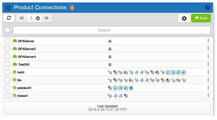 The Product Connections page allows you to create a new connection between Ops Console and Automate Enterprise, as well as edit or delete existing connections. For convenience, each connected system shows their installed products in the form of an icon. Hover your mouse cursor over an icon to view the name of the associated product. You can disconnect or reconnect existing connections at any time.