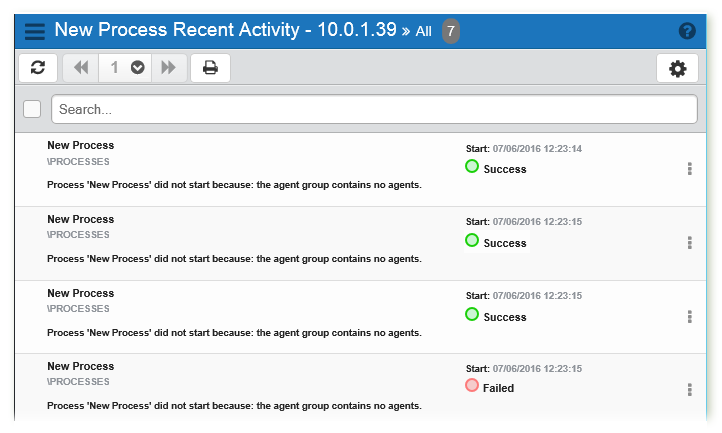 The Process History page (also known as Process Recent Activity page) displays execution history for a specific process. It is useful for gathering information about each runtime instance of a particular process, including when execution started/ended, how long the process ran, and whether it ran successfully or failed. The Process History page also contains preferences for managing and monitoring a specific process, such as the option to immediately run the process or show the workflows where the process is used.