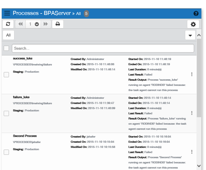 The Processes page displays various attributes about the process objects contained in your repository. It is useful for viewing important details about your processes, such as name, repository location, creation date, last modified date, last run date and result of last run. You can sort the list of processes based on a specific attribute or apply filters to narrow the list based on certain qualifying criteria. The Processes page also contains preferences for managing and monitoring your processes, such as the option to disable, enable or immediately run one or more processes.