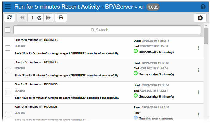 The Task History page (also known as Recent Activity page) displays historic data gathered from previous runs of a particular task. It is useful for tracking significant information about each run instance of a task, such as when execution started/ended, how long the task ran, and whether it ran successfully or failed. Completion statistics are color coded for easy detection. The Task History page also contains preferences for managing and monitoring a task, such as the option to immediately run the task or show the workflows that currently use the task.