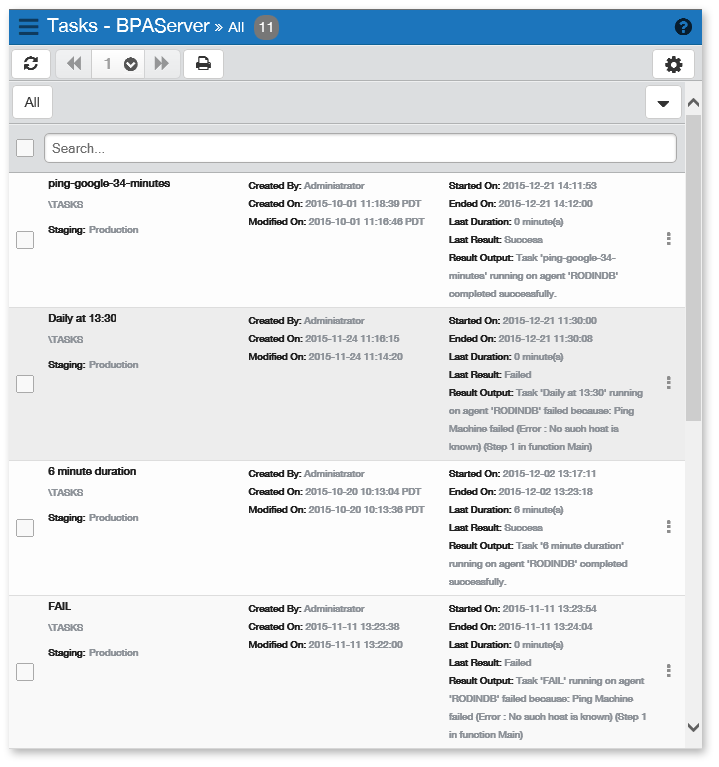 The Tasks page displays various attributes about the tasks contained in your repository. It is useful for viewing important task details, such as name, repository location, creation date, last modified date, last run date and result of last run. You can sort the list of tasks based on a specific attribute or apply filters to narrow the list based on certain qualifying criteria. The Tasks page also contains preferences for managing and monitoring tasks, such as the option to disable, enable or immediately run one or more tasks.