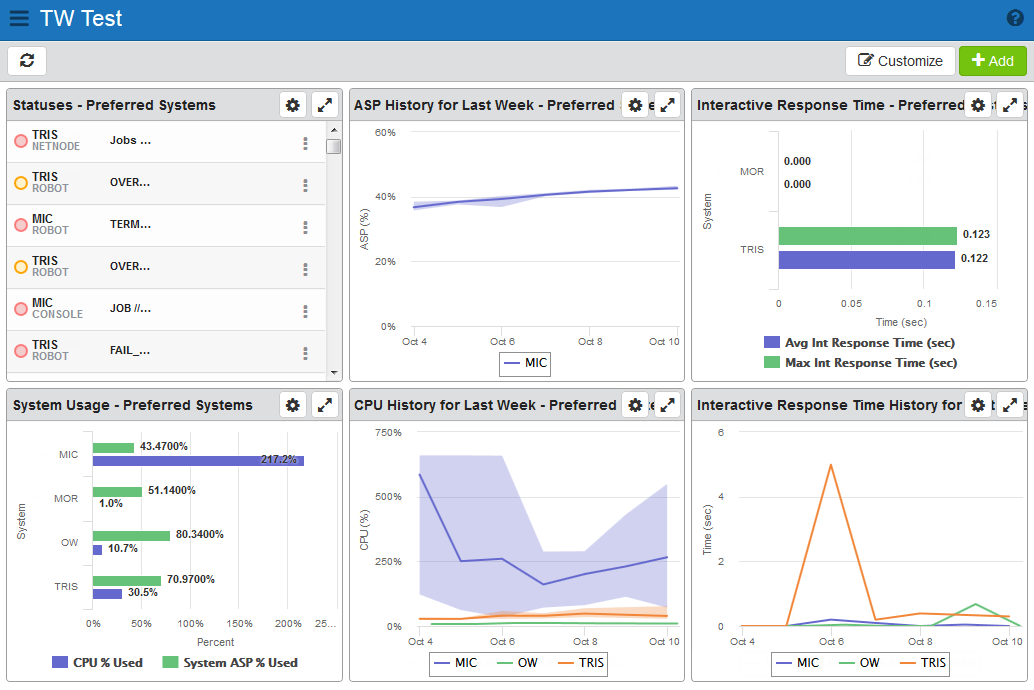The Robot Network dashboards display information from the systems that Robot Network monitors. Use the dashboards for viewing and analyzing data from across your network all on one screen. You can quickly view the number of jobs on each system, what percentage of your messages are being answered automatically by Robot Console, your CPU usage, your ASP usage, the interactive response time on the systems, and more.