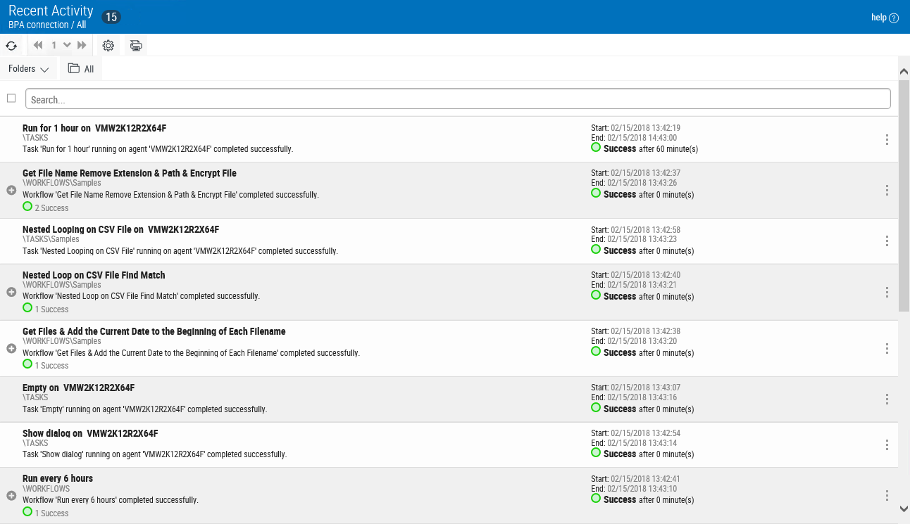The Recent Activity page displays a history of automation objects that previously ran. From here, you can view recent executions of workflows, tasks and processes, when they started and ended, and whether they ran successfully or failed. The page can be filtered in various ways so that only data that matches the selected pattern is shown, giving you more control over which activities should appear. Click the Recent Activity section at the top of the pane to access the Recent Activity page.