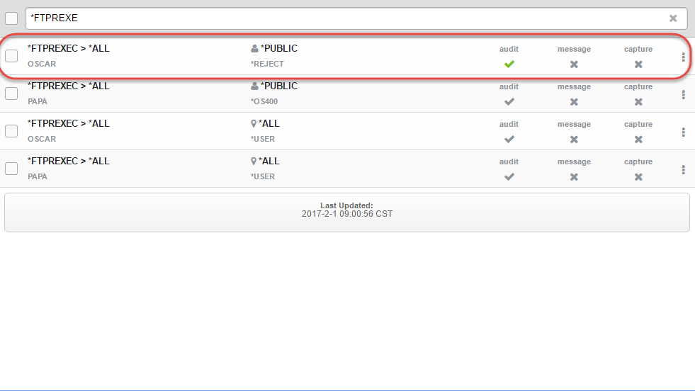 - On the Rules screen, click the *PUBLIC rule for the *FTPREXEC server.