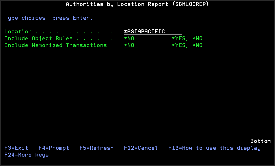 The Authorities by Location Report (SBMLOCREP) command produces the "Location/IP Address Rules Listing" report. The report can optionally list the Object Rules and Memorized Transaction associated with the Locations printed on the report.