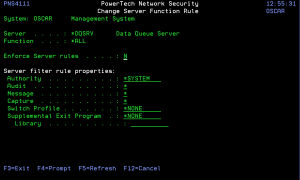 The Change Server Function Rule panel allows you to change one or more of the properties for a selected server. To change a server property, type over the existing value and press Enter. Server Function Rules provide processing control to Powertech's exit programs and also act as defaults for server function values.