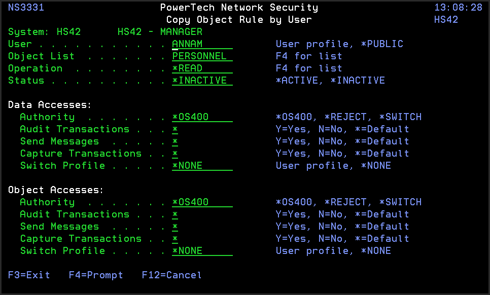 From the Network Security Main Menu, select option 4 to display the Work with Security by Object panel. Select option 1 to display the Work with Object Lists panel, then enter an 9 in the Opt column on one of the Object Lists. On the Object Rules using Object List panel, enter a 3 in the Opt column and a User. Press Enter to display the Copy Object Rule by User panel.