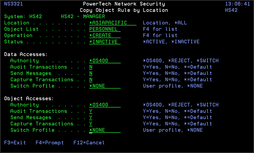 From the Network Security Main Menu, select option 4 to display the Work with Security by Object panel. Select option 1 to display the Work with Object Lists panel, then enter an 9 in the Opt column on one of the Object Lists. On the Object Rules using Object List panel, enter a 3 in the Opt column and a Location. Press Enter to display the Copy Object Rule by Location panel.