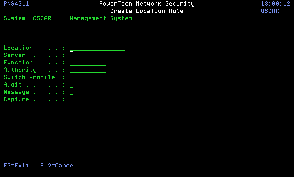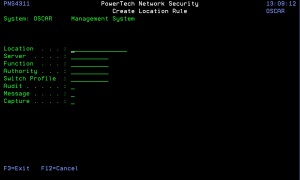 From the Network Security Main Menu, select option 3 to display the Work with Security by Location panel. Press F6 to create a new Location rule.