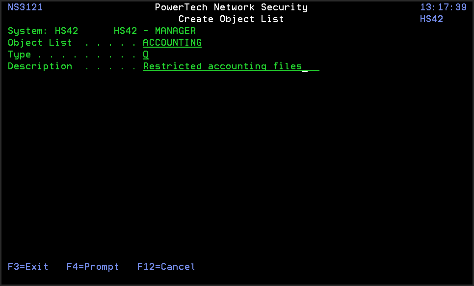 From the Network Security Main Menu, select option 4 to display the Work with Security by Object panel. Select option 1 to display the Work with Object Lists panel, then enter a 1 in the Opt column on the first line of the Work with Object Lists panel. You can enter the Object List name, type, and description in the blank lines or press Enter to display the Create Object List panel.