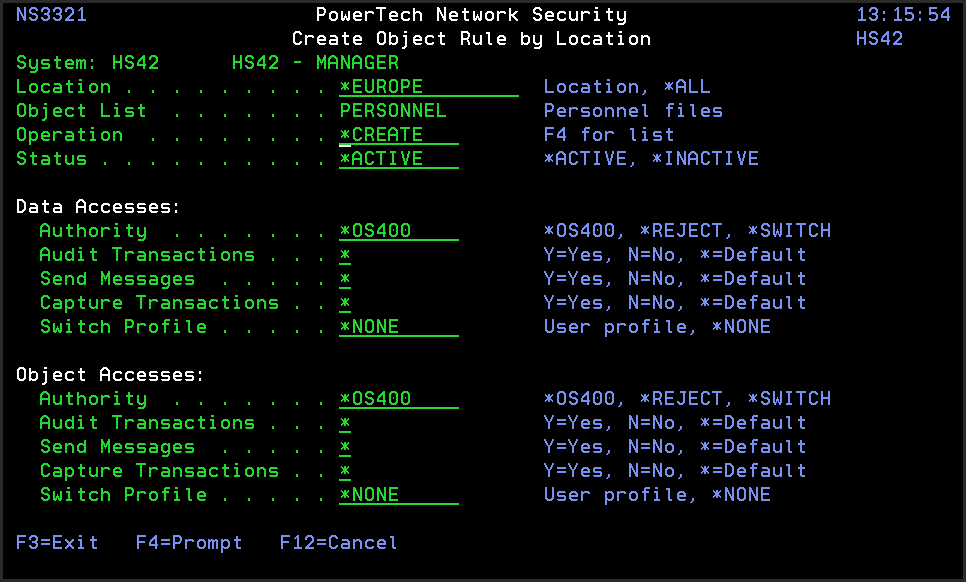 From the Network Security Main Menu, select option 4 to display the Work with Security by Object panel. Select option 1 to display the Work with Object Lists panel, then enter an 9 in the Opt column on one of the Object Lists. On the Object Rules using Object List panel, enter a 1 in the Opt column and a Location. Press Enter to display the Create Object Rule by Location panel.