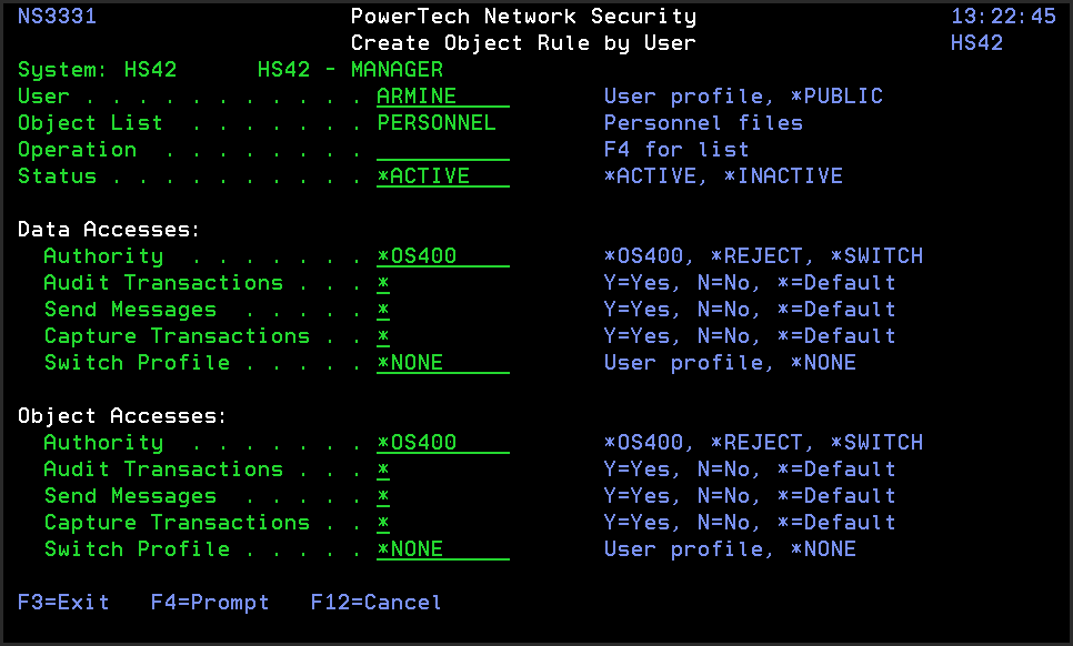 From the Network Security Main Menu, select option 4 to display the Work with Security by Object panel. Select option 1 to display the Work with Object Lists panel, then enter an 9 in the Opt column on one of the Object Lists. On the Object Rules using Object List panel, enter a 1 in the Opt column and a User name. Press Enter to display the Create Object Rule by User panel.