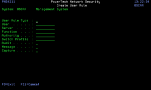 From the Network Security Main Menu, select option 2 to display the Work with Security by User panel. Press F6 to create a new user rule.