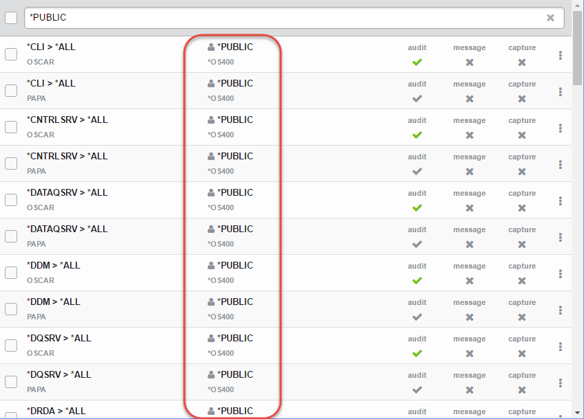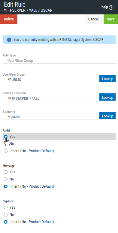 Network Security’s default (*PUBLIC) User Rules apply to all (*ALL) Functions on all servers that permit remote access. Each is defined to inherit (*) the Audit (Aud) value from the product's global system values.