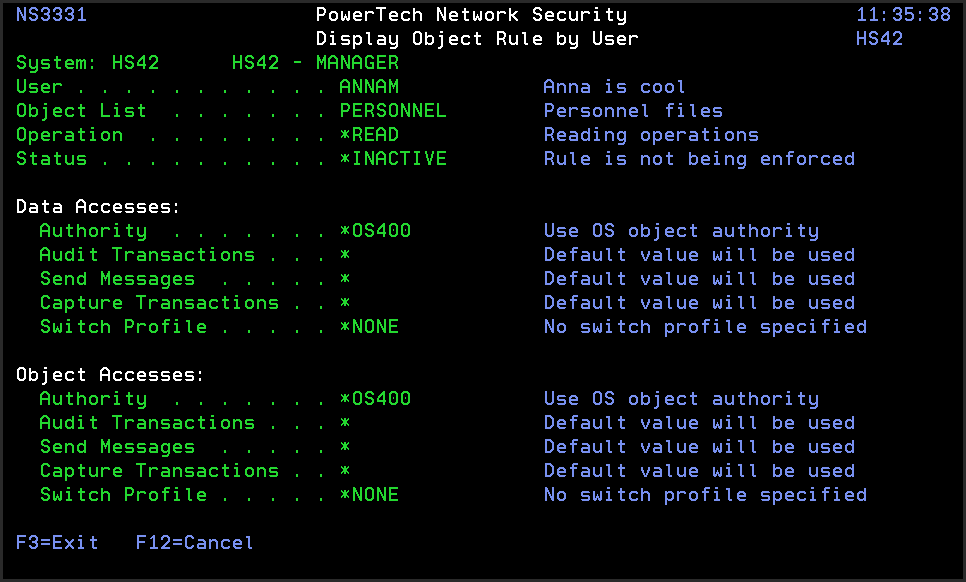 User represents the identity of the person initiating a transaction as a user profile. The special value *PUBLIC, when used on a rule, means that the rule applies to any User lacking a specific rule. when used as a subset or selection parameter, *PUBLIC means to select all such rules for display or printing.