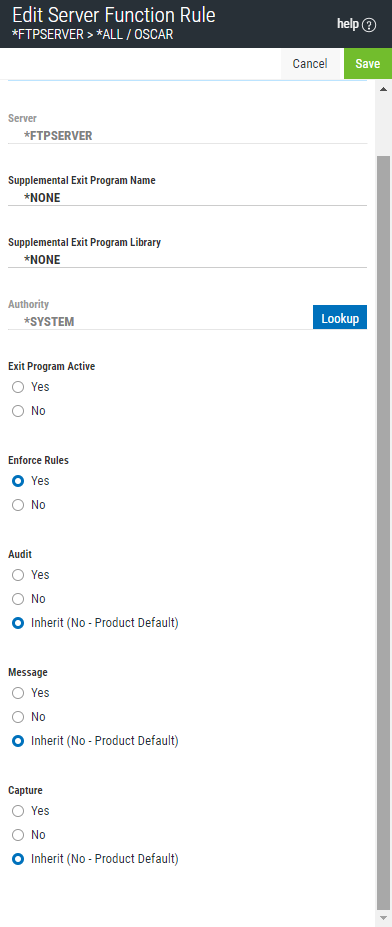 The Edit Server Function Rule screen is used to maintain the server function's properties. Server function options provide processing control to Powertech's exit programs. They also act as defaults for location, user, and memorized transaction request level values.