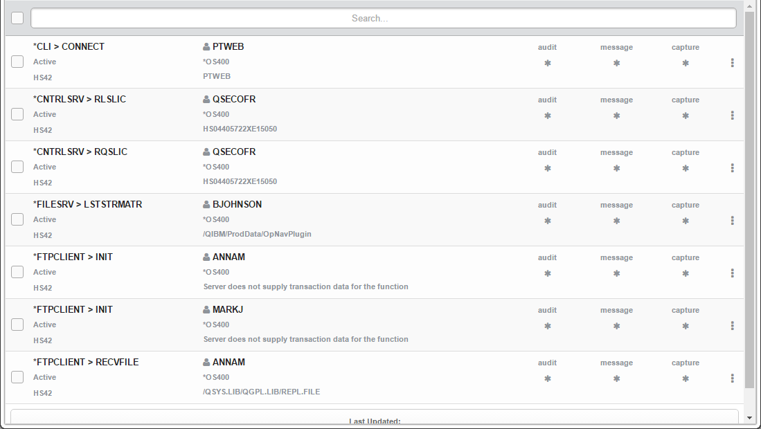 *ACTIVE Network Security will attempt to match this transaction during rule enforcement. Memorized Transactions that are changed to *ACTIVE will have a matching User or Location rule changed to the corresponding action; *ALLOW to *MEMOS400, *REJECT to *MEMREJECT, or *SWITCH to *MEMSWITCH.