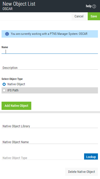 The New Native Object List screen is used to define a new Native Object List. The Edit Native Object List screen is used to edit an existing Native Object List.