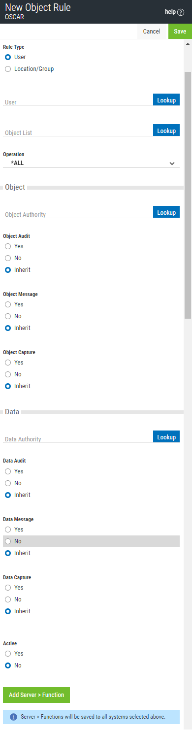The New User Object Rule screen is used to add new User Object Rules. The Edit User Object Rule screen includes identical options and is used to edit an existing User Object rule. Object rules are used to control access to Object Lists. See Object Rules.
