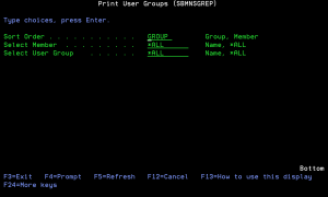 The User Group Report (SBMNSGREP) command produces the "User Group" report. This report lists User Groups and their members. User Groups Members are user profiles that have been added to User Groups.