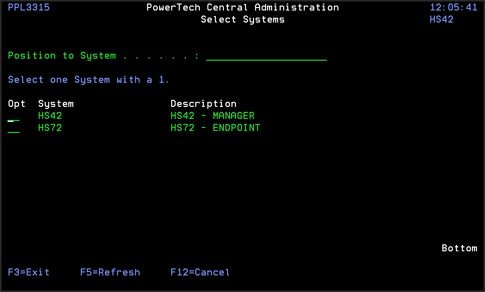 Press F7 (Select System) on any panel that includes this command.