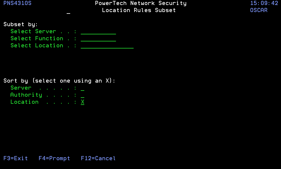 From the Work with Security by Location panel, press F16, Sort/Subset.