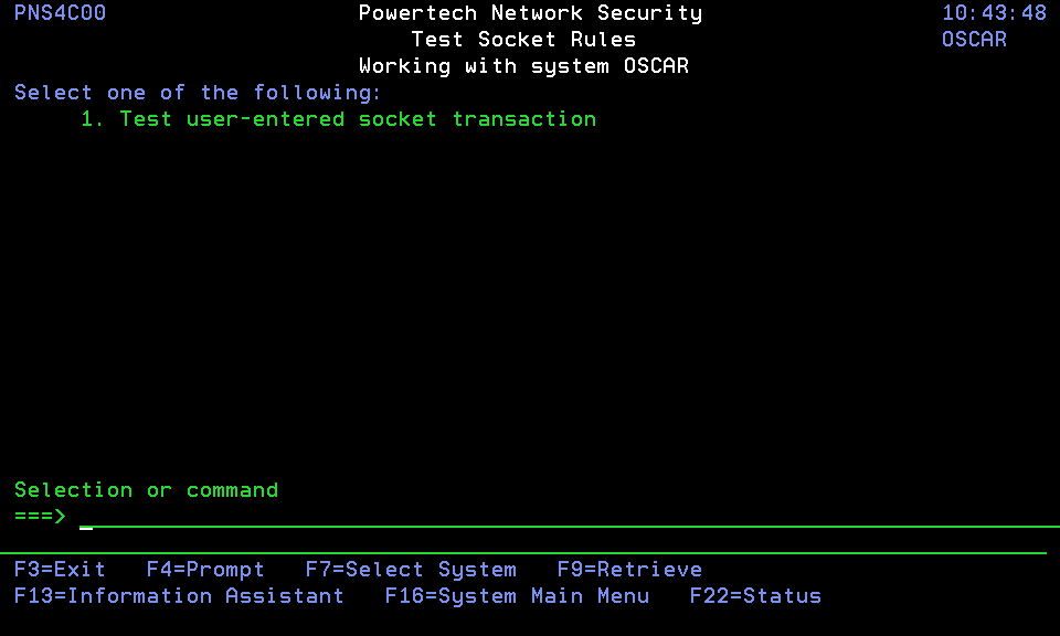 1. Test user-entered socket transaction. This option allows you to test user-entered socket transactions via the command PNSTSTQSO. See Test Socket Rules command (PNSTSTQSO).