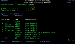 - Choose 8 for a User Group. The Work with User Group Members panel appears. Here, an entry appears for every user and group combination. For example, if ADAMW is in multiple User Groups, user ADAMW will be listed multiple times - once for each User Group in which he is a member.