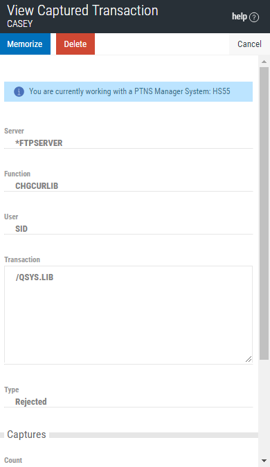 Select Memorize to save this captured transaction as a Memorized Transaction for the user. See Memorized Transactions screen.