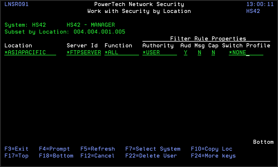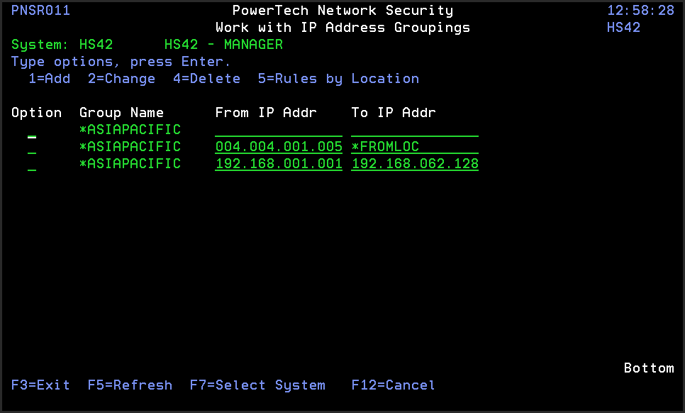 The work with IP Address Groupings is used to associate specific locations to one identifier. To add a new IP Address Grouping, enter the information on the blank line below the column headings. Type an option next to a specific group and press Enter. You can type option numbers next to more than one group at a time. This allows you to do more than one task at a time. If you see ‘More...' in the lower right corner of your display, there is more information to be listed. Press the Page Down (Roll Up) key to move toward the end of the IP Address Groups. Press the Page Up (Roll Down) key to move toward the beginning of the IP Address Groups.