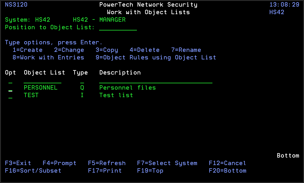 F17 (Print): Prompts the PRTOBJL command to print the list of Object Lists using your current sort/subset criteria.