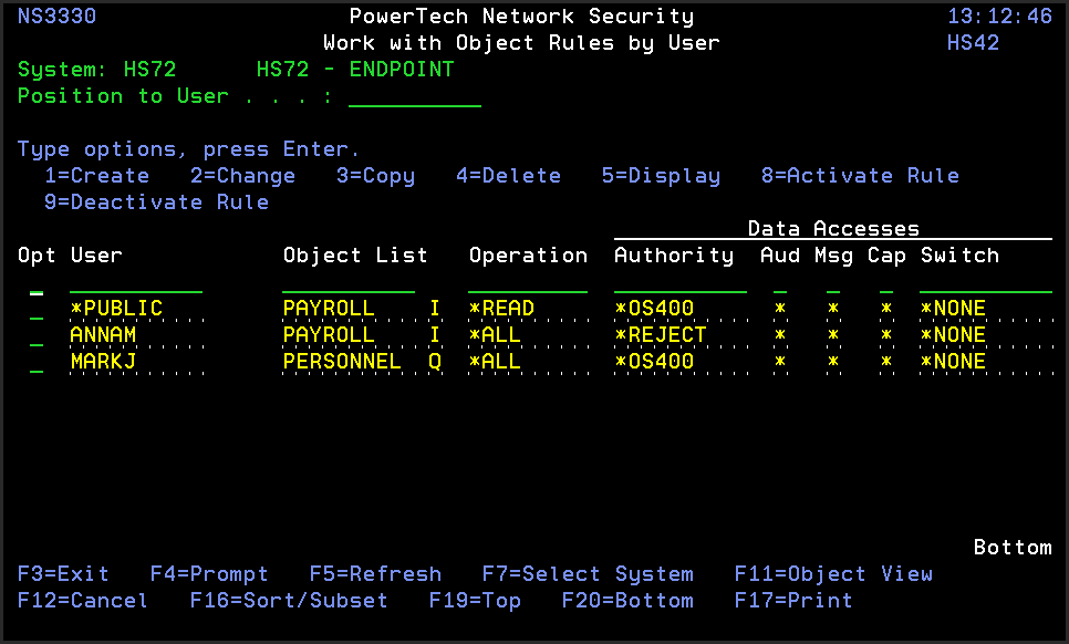 From the Network Security Main Menu, select option 4 to display the Work with Security by Object panel. Select option 2 to display the Work with Object Rules by User panel.