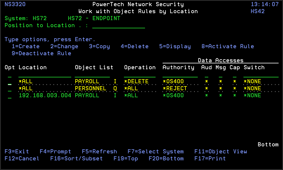 From the Network Security Main Menu, select option 4 to display the Work with Security by Object panel. Select option 3 to display the Work with Object Rules by Location panel.