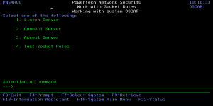 The Work with Socket Rules panel allows you to view or change Socket Rules. Socket Rules are examined by Powertech Network Security exit programs until a match is found (based on a Socket Rule's Socket Conditions).