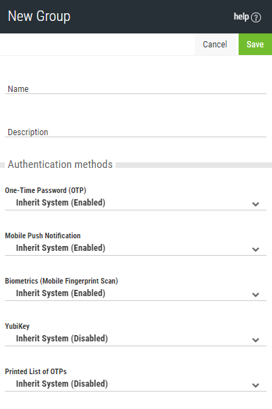 Here, specify authentication settings for the Group. All users in the Group will inherit these Authentication Settings, which override the Authentication Settings in Settings. (The same five authentication options are available.)