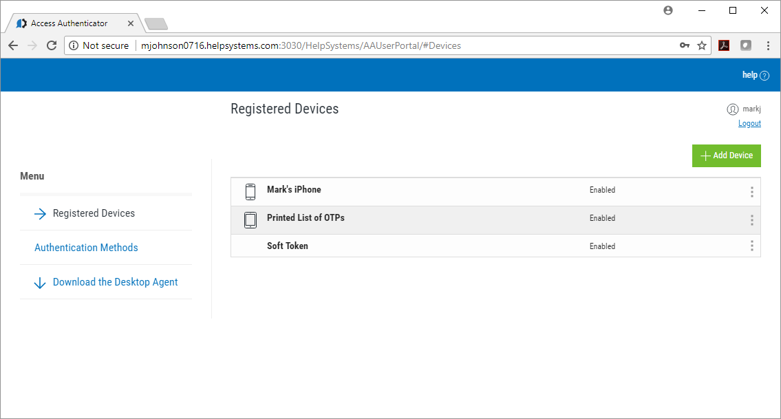Click Add Device to open the Add Device screen where you can register a YubiKey or Mobile Device. See User Setup.